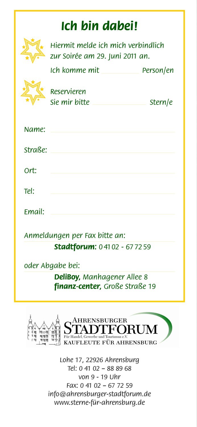 Gerne können Sie auch unser vorbereitetes Anmeldeformular nutzen. Bitte faxen Sie dieses an die Faxnummer 0 41 02 / 677 259 oder geben Sie das Formular einfach bei DeliBoy oder im finanz-center ab.